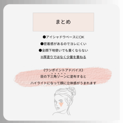 ・目の下三角ゾーンに塗布すると、自然なハイライト効果で顔に立体感が出る